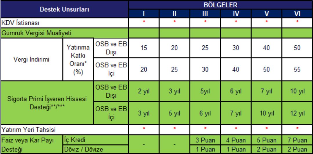 **Teşvik belgesi düzenlenmesine ilişkin müracaat aşamasında talep edilmesi halinde, vergi indiriminden yararlanılmamak kaydıyla, desteğin sabit yatırım tutarına oranı, yatırıma katkı oranının yarısı kadar artırılarak uygulanır. ***Kadın ve/veya genç istihdamının desteklenmesi amacıyla, kadın ve/veya genç istihdam eden firmaların istihdam desteklerinden yararlanabilme süreleri uzatılmıştır.